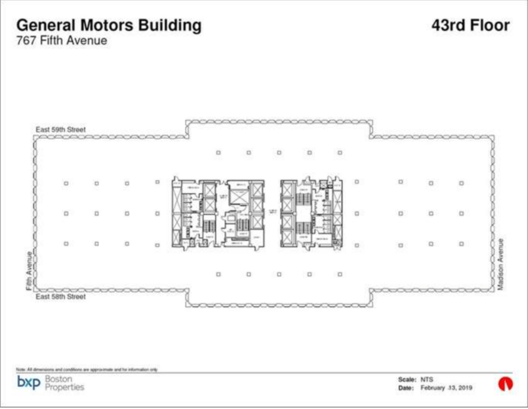 The General Motors Building at 767 Fifth Avenue is a Class A property built in 1968 by Cecilia Benattar, designed by Edward Durell Stone, and renovated in 2019. It is one of New York City’s most iconic office buildings and one of the few to occupy an entire city block. Located at the southeast corner of Central Park between Fifth and Madison Avenues and 58th and 59th streets, the building is 705 feet, 50 stories, and features roughly 1.9 million square feet of office space.