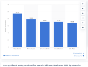 So weigh your options and see what average asking rents are in neighborhoods and submarkets. For instance, in Midtown, the modern towers of Hudson Yards ask for rents exceeding $100 per square foot. For Class A spaces, landlords also may ask for rents of $95.25/SF on average in the Plaza District.